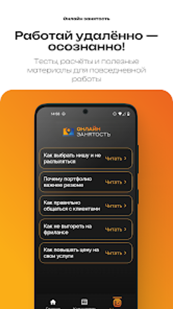 Онлайн Занятость é um aplicativo projetado para ajudar usuários a entenderem melhor seu estilo de trabalho e a avaliar opções de renda no contexto do trabalho remoto e freelance. O aplicativo é dividido em três seções principais: um teste de autoconhecimento, um calculador financeiro e uma área de aprendizado. No teste, os usuários respondem a perguntas sobre sua abordagem em novas tarefas e situações de estresse, permitindo que o aplicativo forneça um perfil que destaca suas forças e ambientes de trabalho ideais.